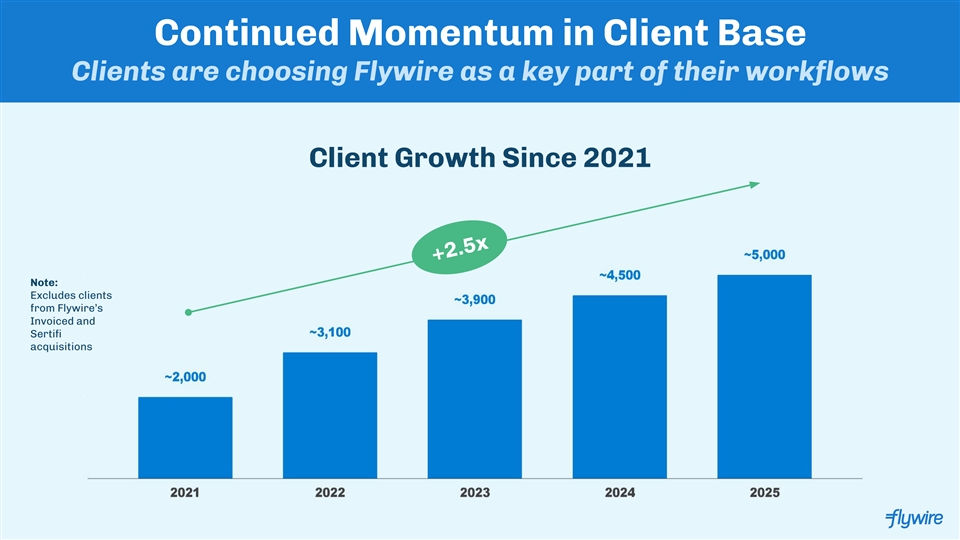 Continued Momentum in Client Base Clients are choosing Flywire as a key part of their workflows Client Growth Since 2021 Note: Excludes clients from Flywire’s Invoiced and Sertifi acquisitions +2.5x
