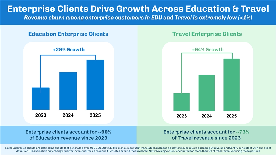 Enterprise Clients Drive Growth Across Education & Travel Revenue churn among enterprise customers in EDU and Travel is extremely low (<1%) Education Enterprise Clients Travel Enterprise Clients +29% Growth +94% Growth Enterprise clients account for ~90% Enterprise clients account for ~73% of Education revenue since 2023 of Travel revenue since 2023 Note: Enterprise clients are defined as clients that generated over USD 100,000 in LTM revenue (spot USD-translated). Includes all platforms/products excluding StudyLink and Sertifi, consistent with our client definition. Classification may change quarter-over-quarter as revenue fluctuates around the threshold. Note: No single client accounted for more than 2% of total revenue during these periods