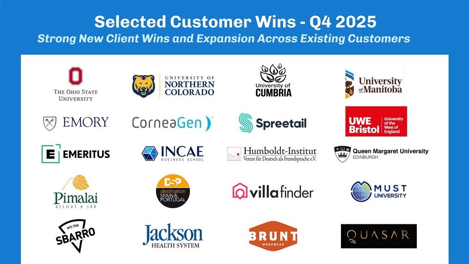 | | Client Wins & Retention: Secured approximately 750 new customer wins across 52 countries, while maintaining elite-tier retention with sub-1% revenue churn across our core Education and Travel verticals. |