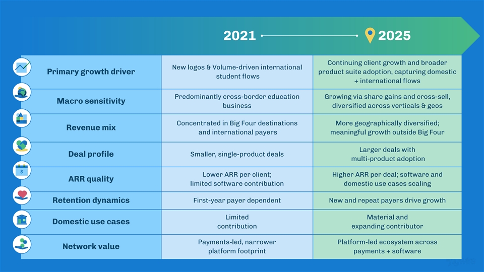 2021 2025 Continuing client growth and broader New logos & Volume-driven international product suite adoption, capturing domestic Primary growth driver student flows + international flows Predominantly cross-border education Growing via share gains and cross-sell, Macro sensitivity business diversified across verticals & geos Concentrated in Big Four destinations More geographically diversified; Revenue mix and international payers meaningful growth outside Big Four Larger deals with Smaller, single-product deals Deal profile multi-product adoption Lower ARR per client; Higher ARR per deal; software and ARR quality limited software contribution domestic use cases scaling Retention dynamics First-year payer dependent New and repeat payers drive growth Limited Material and Domestic use cases contribution expanding contributor Payments-led, narrower Platform-led ecosystem across Network value platform footprint payments + software