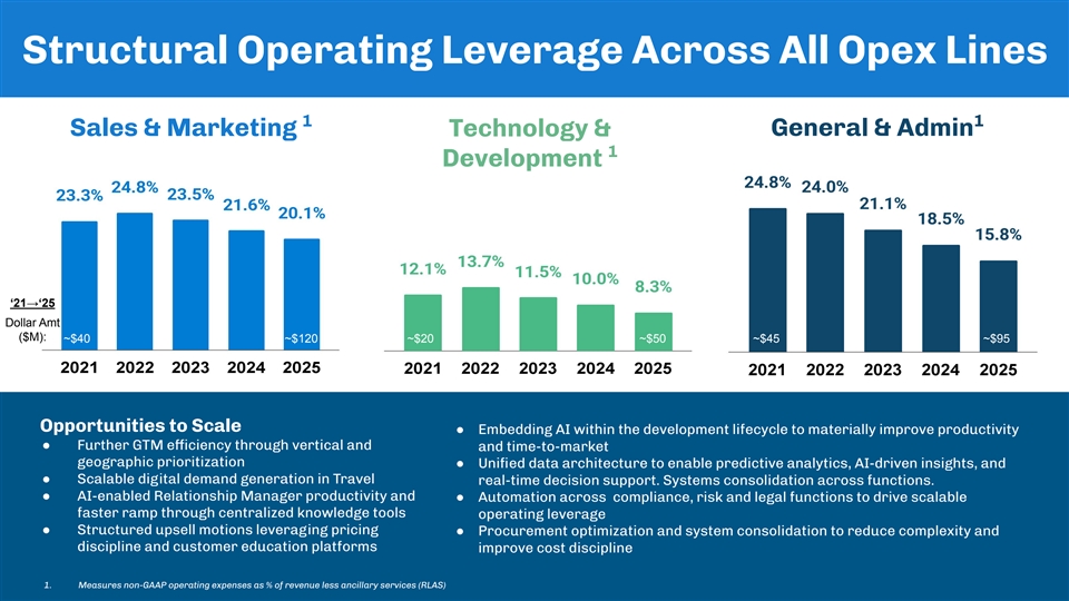 Structural Operating Leverage Across All Opex Lines 1 1 Sales & Marketing Technology & General & Admin 1 Development ‘21→‘25 ● Embedding AI within the Dollar Amt development lifecycle to ($M): ~$40 ~$120 ~$20 materially improve productivity ~$50 ~$45 ~$95 and time-to-market Opportunities to Scale ● Embedding AI within the development lifecycle to materially improve productivity ● Further GTM efficiency through vertical and and time-to-market geographic prioritization ● Unified data architecture to enable predictive analytics, AI-driven insights, and ● Scalable digital demand generation in Travel real-time decision support. Systems consolidation across functions. ● AI-enabled Relationship Manager productivity and ● Automation across compliance, risk and legal functions to drive scalable faster ramp through centralized knowledge tools operating leverage ● Structured upsell motions leveraging pricing ● Procurement optimization and system consolidation to reduce complexity and discipline and customer education platforms improve cost discipline 1. Measures non-GAAP operating expenses as % of revenue less ancillary services (RLAS)