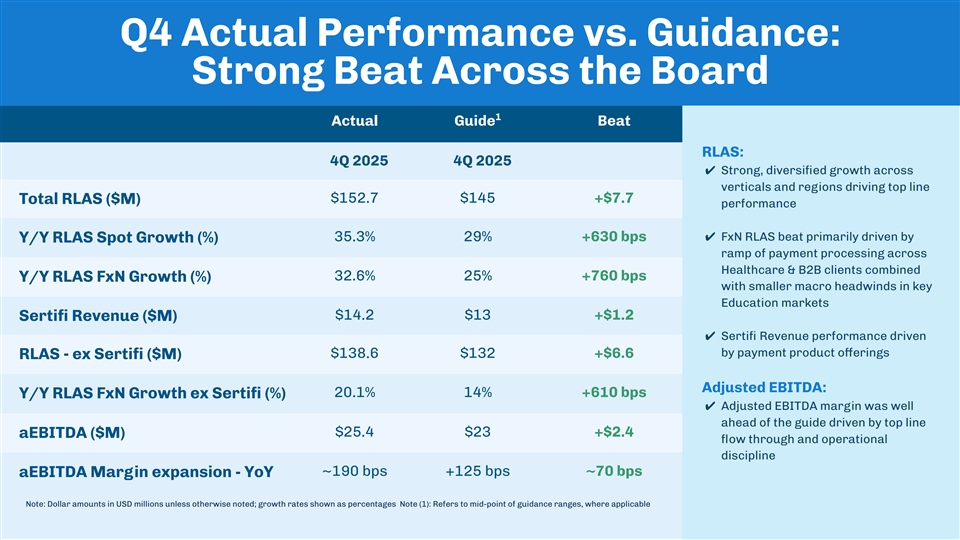 Q4 Actual Performance vs. Guidance: Strong Beat Across the Board 1 Actual Guide Beat RLAS: 4Q 2025 4Q 2025 ✔ Strong, diversified growth across verticals and regions driving top line $152.7 $145 +$7.7 Total RLAS ($M) performance 35.3% 29% +630 bps✔ FxN RLAS beat primarily driven by Y/Y RLAS Spot Growth (%) ramp of payment processing across Healthcare & B2B clients combined 32.6% 25% +760 bps Y/Y RLAS FxN Growth (%) with smaller macro headwinds in key Education markets $14.2 $13 +$1.2 Sertifi Revenue ($M) ✔ Sertifi Revenue performance driven by payment product oerings ff $138.6 $132 +$6.6 RLAS - ex Sertifi ($M) Adjusted EBITDA: 20.1% 14% +610 bps Y/Y RLAS FxN Growth ex Sertifi (%) ✔ Adjusted EBITDA margin was well ahead of the guide driven by top line $25.4 $23 +$2.4 aEBITDA ($M) flow through and operational discipline ~190 bps +125 bps ~70 bps aEBITDA Margin expansion - YoY Note: Dollar amounts in USD millions unless otherwise noted; growth rates shown as percentages Note (1): Refers to mid-point of guidance ranges, where applicable