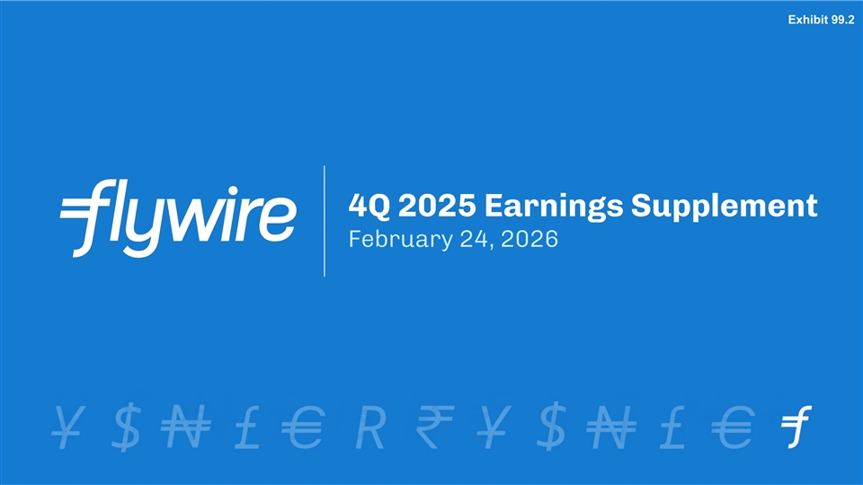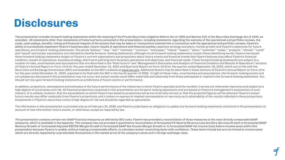 Disclosures This presentation includes forward-looking statements within the meaning of the Private Securities Litigation Reform Act of 1995 and Section 21E of the Securities Exchange Act of 1934, as amended. All statements other than statements of historical facts contained in this presentation, including statements regarding the outcome of the operational and portfolio reviews, the costs, cash outlays, benefits, timing and financial impacts of the actions that may be taken or transactions entered into in connection with the operational and portfolio reviews, Flywire’s ability to successfully implement Flywire’s business plan, future results of operations and financial position, business strategy and plans, market growth and Flywire’s objectives for future operations, are forward -looking statements. The words “believe,” “may,” “will,” “estimate,” “continue,” “anticipate,” “intend,” “expect,” “plans,” “potential,” “seeks,” “projects,” “should,” “could” and “would” and similar expressions are intended to identify forward -looking statements, although not all forward-looking statements contain these identifying words. Flywire has based these forward-looking statements largely on Flywire’s current expectations and projections about future events and financial trends that Flywire believes may affect Flywire’s financial condition, results of operations, business strategy, short-term and long-term business operations and objectives, and financial needs. These forward-looking statements are subject to a number of risks, uncertainties and assumptions that are described in the Risk Factors and Management's Discussion and Analysis of Financial Condition and Results of Operations sections of Flywire's Annual Report on Form 10-K for the year ended December 31, 2024 and Quarterly Report on Form 10-Q for the quarter ended September 30, 2025, which are on file with the Securities and Exchange Commission (SEC) and available on the SEC’s website at www.sec.gov. Additional factors may be described in those sections of Flywire’s Annual Report on Form 10-K for the year ended December 31, 2025, expected to be filed with the SEC in the fourth quarter of 2026. In light of these risks, uncertainties and assumptions, the forward -looking events and circumstances discussed in this presentation may not occur and actual results could dier ma ff terially and adversely from those anticipated or implied in the forward-looking statements. You should not rely upon forward-looking statements as predictions of future events or performance. In addition, projections, assumptions and estimates of the future performance of the industries in which Flywire operates and the markets it serves are inherently imprecise and subject to a high degree of uncertainty and risk. All financial projections contained in this presentation are forward -looking statements and are based on Flywire’s management’s assessment of such matters. It is unlikely, however, that the assumptions on which Flywire has based its projections will prove to be fully correct or that the projected figures will be attained. Flywire’s actual future results may dier ma ff terially from Flywire’s projections, and it makes no express or implied representation or warranty as to attainability of the results reflected in these projections. Investments in Flywire’s securities involve a high degree of risk and should be regarded as speculative. The information in this presentation is provided only as of February 24, 2026, and Flywire undertakes no obligation to update any forward-looking statements contained in this presentation on account of new information, future events, or otherwise, except as required by law. This presentation contains certain non-GAAP financial measures as defined by SEC rules. Flywire has provided a reconciliation of those measures to the most directly comparable GAAP measures, which is available in the Appendix. The company has not provided a quantitative reconciliation of forecasted FX-Neutral Revenue Less Ancillary Services Growth to forecasted GAAP Revenue Growth or forecasted Adjusted EBITDA Margin Growth to forecasted GAAP Net Income Margin Growth or to forecasted GAAP net income (loss) before income taxes within this presentation because Flywire is unable, without making unreasonable eorts, to calcula ff te certain reconciling items with confidence. These items include but are not limited to income taxes which are directly impacted by unpredictable fluctuations in the market price of the company's stock and in foreign exchange rates.