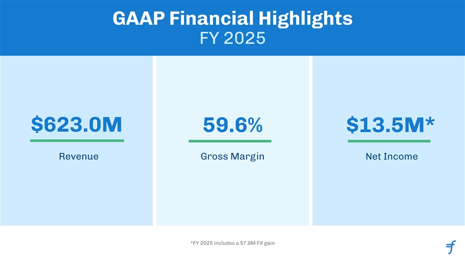 GAAP Financial Highlights FY 2025 $623.0M 59.6% $13.5M* Revenue Gross Margin Net Income *FY 2025 includes a $7.9M FX gain