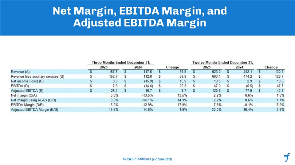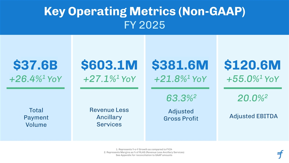 Key Operating Metrics (Non-GAAP) FY 2025 $37.6B $603.1M $381.6M $120.6M 1 1 1 1 +26.4% YoY +27.1% YoY +21.8% YoY +55.0% YoY 2 2 63.3% 20.0% Revenue Less Total Adjusted Adjusted EBITDA Ancillary Payment Gross Profit Services Volume 1. Represents Y-o-Y Growth as compared to FY24 2. Represents Margins as % of RLAS (Revenue Less Ancillary Services) See Appendix for reconciliation to GAAP amounts