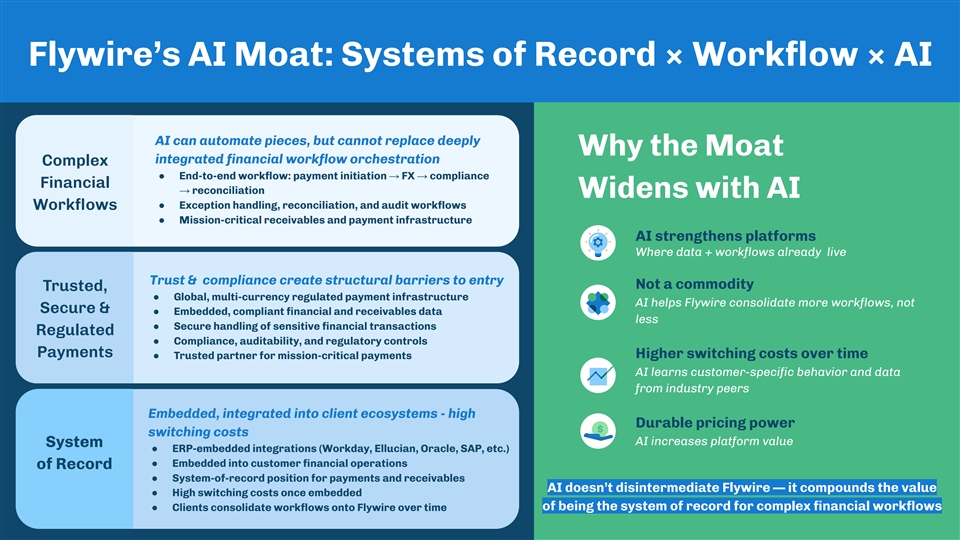Flywire’s AI Moat: Systems of Record × Workflow × AI AI can automate pieces, but cannot replace deeply Why the Moat integrated financial workflow orchestration Complex ● End-to-end workflow: payment initiation → FX → compliance Financial → reconciliation Widens with AI ● Exception handling, reconciliation, and audit workflows Workflows ● Mission-critical receivables and payment infrastructure AI strengthens platforms Where data + workflows already live Trust & compliance create structural barriers to entry Not a commodity Trusted, ● Global, multi-currency regulated payment infrastructure AI helps Flywire consolidate more workflows, not Secure & ● Embedded, compliant financial and receivables data less ● Secure handling of sensitive financial transactions Regulated ● Compliance, auditability, and regulatory controls Payments Higher switching costs over time ● Trusted partner for mission-critical payments AI learns customer-specific behavior and data from industry peers Embedded, integrated into client ecosystems - high Durable pricing power switching costs AI increases platform value System ● ERP-embedded integrations (Workday, Ellucian, Oracle, SAP, etc.) ● Embedded into customer financial operations of Record ● System-of-record position for payments and receivables AI doesn’t disintermediate Flywire — it compounds the value ● High switching costs once embedded ● Clients consolidate workflows onto Flywire over time of being the system of record for complex financial workflows
