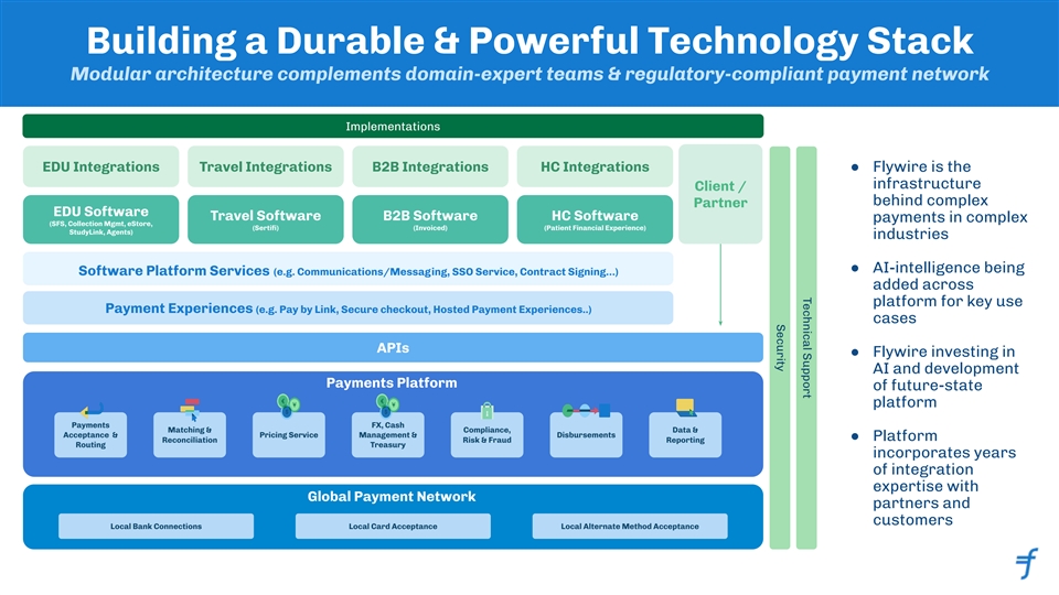 Technical Support Security Building a Durable & Powerful Technology Stack Modular architecture complements domain-expert teams & regulatory-compliant payment network Implementations EDU Integrations Travel Integrations B2B Integrations HC Integrations ● Flywire is the infrastructure Client / behind complex Partner EDU Software Travel Software B2B Software HC Software payments in complex (SFS, Collection Mgmt, eStore, (Sertifi) (Invoiced) (Patient Financial Experience) StudyLink, Agents) industries ● AI-intelligence being Software Platform Services (e.g. Communications/Messaging, SSO Service, Contract Signing…) added across platform for key use Payment Experiences (e.g. Pay by Link, Secure checkout, Hosted Payment Experiences..) cases APIs ● Flywire investing in AI and development Payments Platform of future-state platform Payments FX, Cash Matching & Compliance, Data & Acceptance & Pricing Service Management & Disbursements ● Platform Reconciliation Risk & Fraud Reporting Routing Treasury incorporates years of integration expertise with Global Payment Network partners and customers Local Bank Connections Local Card Acceptance Local Alternate Method Acceptance