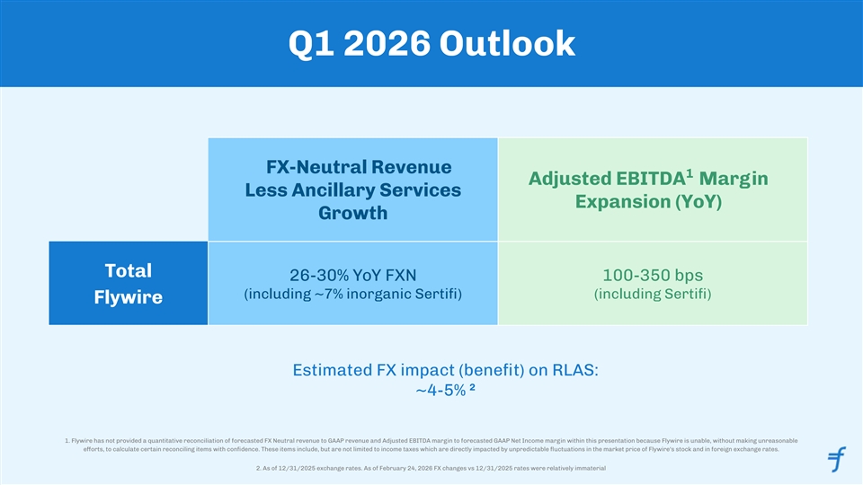 Q1 2026 Outlook FX-Neutral Revenue 1 Adjusted EBITDA Margin Less Ancillary Services Expansion (YoY) Growth Total 26-30% YoY FXN 100-350 bps (including ~7% inorganic Sertifi) (including Sertifi) Flywire Estimated FX impact (benefit) on RLAS: 2 ~4-5% 1. Flywire has not provided a quantitative reconciliation of forecasted FX Neutral revenue to GAAP revenue and Adjusted EBITDA margin to forecasted GAAP Net Income margin within this presentation because Flywire is unable, without making unreasonable eorts, to calcula ff te certain reconciling items with confidence. These items include, but are not limited to income taxes which are directly impacted by unpredictable fluctuations in the market price of Flywire's stock and in foreign exchange rates. 2. As of 12/31/2025 exchange rates. As of February 24, 2026 FX changes vs 12/31/2025 rates were relatively immaterial