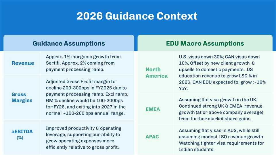 2026 Guidance Context Guidance Assumptions EDU Macro Assumptions Approx. 1% inorganic growth from U.S. visas down 30%; CAN visas down Sertifi. Approx. 2% coming from 10%. Offset by new client growth & Revenue payment processing ramp. North upsells to domestic payments. US education revenue to grow LSD % in America Adjusted Gross Profit margin to 2026. CAN EDU expected to grow > 10% decline 200-300bps in FY2026 due to YoY. payment processing ramp. Excl ramp, Gross Assuming flat visa growth in the UK. Margins GM % decline would be 100-200bps Continued strong UK & EMEA revenue for FY26, and exiting into 2027 in the EMEA growth (at or above company average) normal ~100-200 bps annual range. from further market share gains. Improved productivity & operating Assuming flat visas in AUS, while still aEBITDA leverage, supporting our ability to APAC assuming modest LSD revenue growth. (%) grow operating expenses more Watching tighter visa requirements for efficiently relative to gross profit. Indian students.