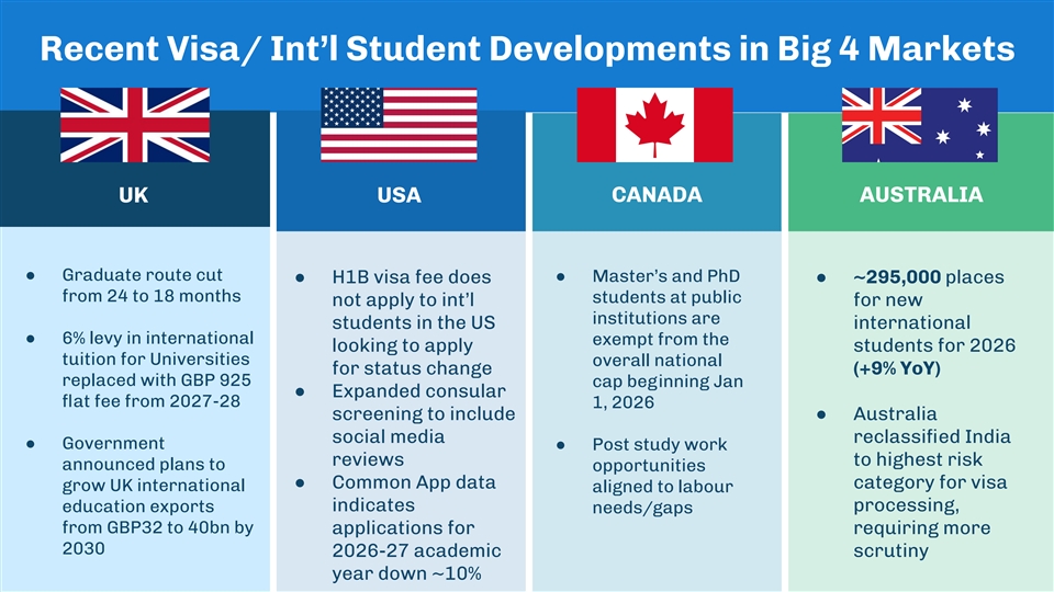 Recent Visa/ Int’l Student Developments in Big 4 Markets CANADA AUSTRALIA UK USA ● Graduate route cut ● Master’s and PhD ● H1B visa fee does ● ~295,000 places from 24 to 18 months students at public not apply to int’l for new institutions are students in the US international ● 6% levy in international exempt from the looking to apply students for 2026 tuition for Universities overall national for status change (+9% YoY) replaced with GBP 925 cap beginning Jan ● Expanded consular flat fee from 2027-28 1, 2026 screening to include ● Australia social med ia reclassified India ● Government ● Post study work reviews to highest risk announced plans to opportunities ● Common App data category for visa grow UK international aligned to labour indicates processing, education exports needs/gaps from GBP32 to 40bn by applications for requiring more 2030 2026-27 academic scrutiny year down ~10%