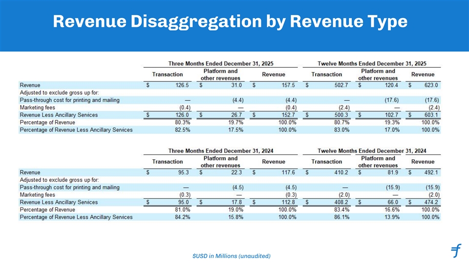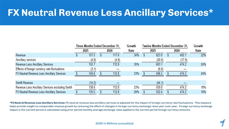 | | Revenue Less Ancillary Services increased 35.3% to $152.7 million in the Fourth quarter of 2025, compared to $112.8 million in the Fourth quarter of 2024. On an FX-neutral basis, Revenue Less Ancillary Services increased 32.6% year-over-year. Excluding Sertifi, Revenue Less Ancillary Services increased 22.8% year over year to $138.6 million or 20.1% year over year on an FX-Neutral basis in the Fourth quarter of 2025. |