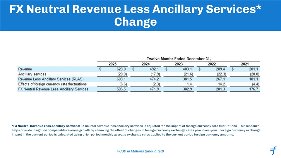 FX Neutral Revenue Less Ancillary Services* *FX Neutral Revenue Less Ancillary Services: FX neutral revenue less ancillary services is adjusted for the impact of foreign currency rate fluctuations. This measure helps provide insight on comparable revenue growth by removing the eect o ff f changes in foreign currency exchange rates year-over-year. Foreign currency exchange impact in the current period is calculated using prior period monthly average exchange rates applied to the current period foreign currency amounts. $USD in Millions (unaudited)