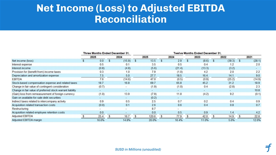 | | Adjusted EBITDA increased to $25.4 million in the Fourth quarter of 2025, compared to $16.7 million in the Fourth quarter of 2024. Our Adjusted EBITDA margin increased by approximately 190 bps year-over-year to 16.6% in the Fourth quarter of 2025. |