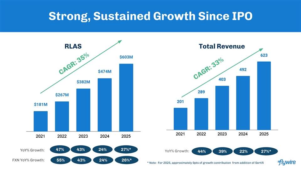 Strong, Sustained Growth Since IPO RLAS RLAS Total Revenue 47% 43% 24% 27%* YoY% Growth: YoY% Growth: 44% 39% 22% 27%* FXN YoY% Growth: 55% 43% 24% 26%* * Note: For 2025, approximately 9pts of growth contribution from addition of Sertifi CAGR: 35% CAGR: 35% CAGR: 33%