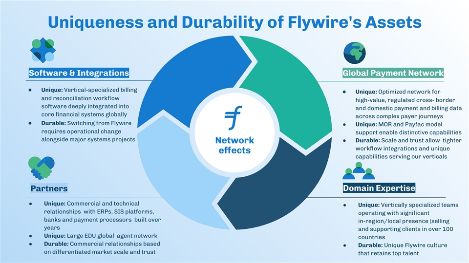 Uniqueness and Durability of Flywire's Assets Software & Integrations Global Payment Network ● Unique: Vertical-specialized billing ● Unique: Optimized network for and reconciliation workflow high-value, regulated cross- border software deeply integrated into and domestic payment and billing data core financial systems globally across complex payer journeys ● Durable: Switching from Flywire ● Unique: MOR and Payfac model requires operational change support enable distinctive capabilities alongside major systems projects ● Durable: Scale and trust allow tighter Network workflow integrations and unique effects capabilities serving our verticals Domain Expertise Partners ● Unique: Commercial and technical ● Unique: Vertically specialized teams relationships with ERPs, SIS platforms, operating with significant banks and payment processors built over in-region/local presence (selling years and supporting clients in over 100 ● Unique: Large EDU global agent network countries ● Durable: Commercial relationships based ● Durable: Unique Flywire culture on dieren ff tiated market scale and trust that retains top talent